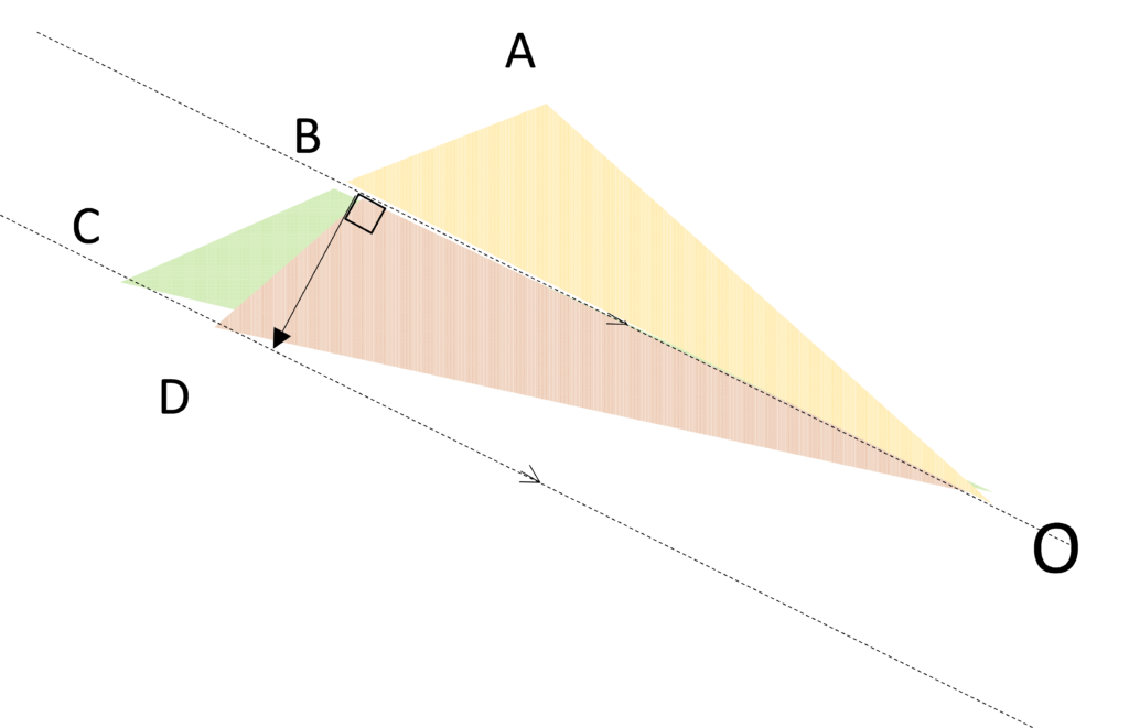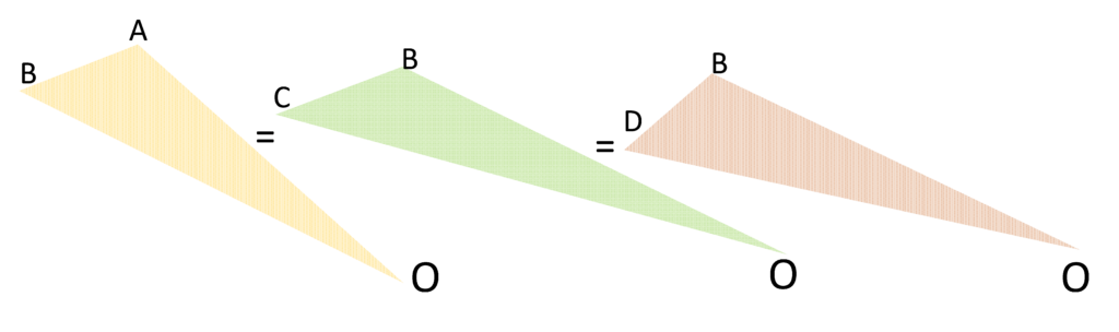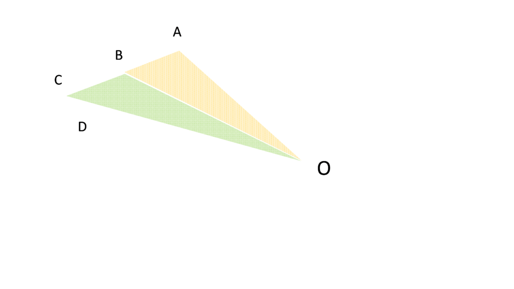 そのとき、等速のためAB = BCですから、三角形OABと三角形OBCは面積が等しくなるはずです。