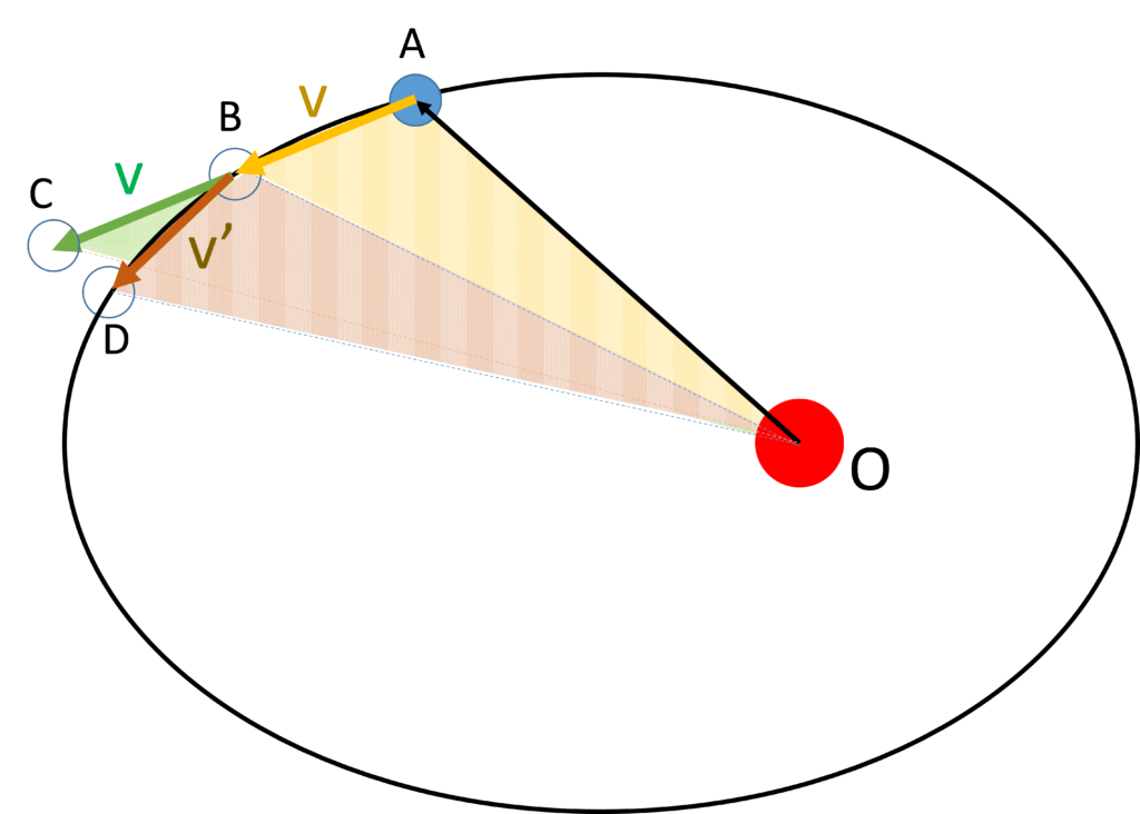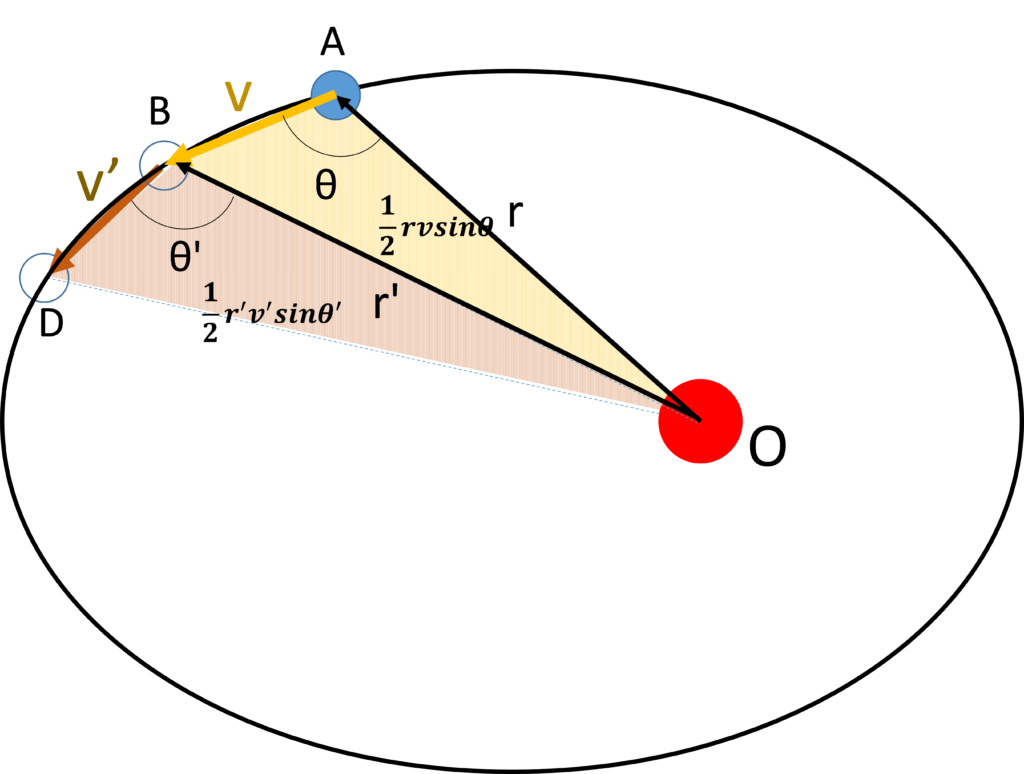 さて、この面積速度一定の法則についてもう少し考えましょう。次の図を見てください。