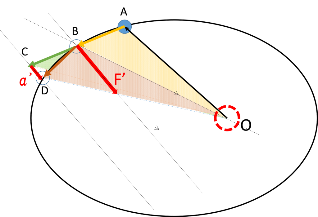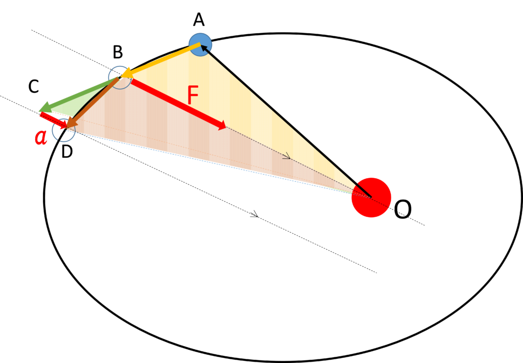 ここで、もしもはたらく力が中心に向いていない場合は、OB と CD が平行でないため三角形OBCと三角形OBDの面積は同じになりません。