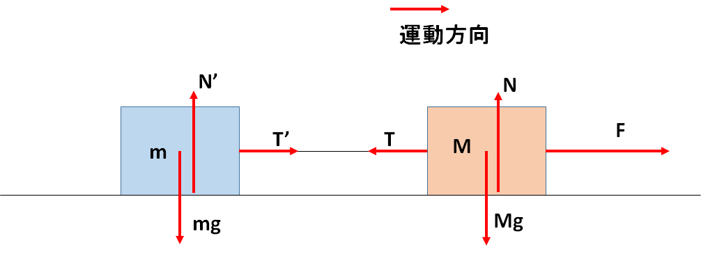 図では、質量 $M$ の物体、質量 $m$ の物体、そして糸は図の右側へ加速度 $a$ で運動しています。
