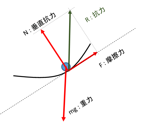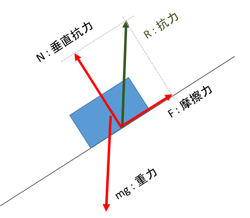 そうですね。この抗力Rの面に対しての垂直成分を垂直抗力とよび、平行な成分を摩擦力としているのです。